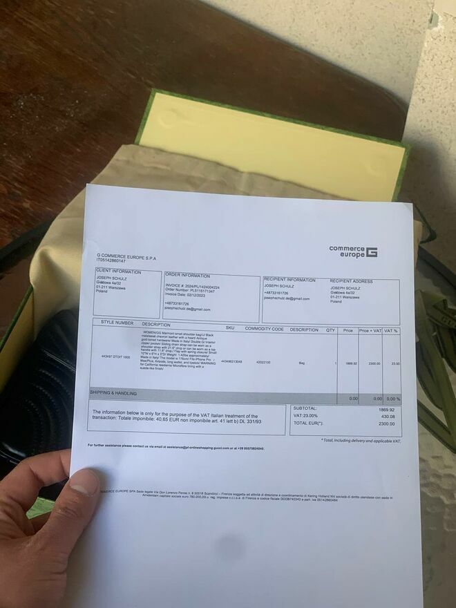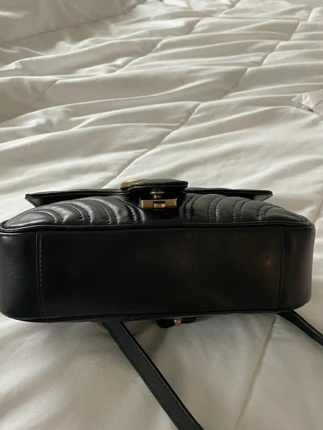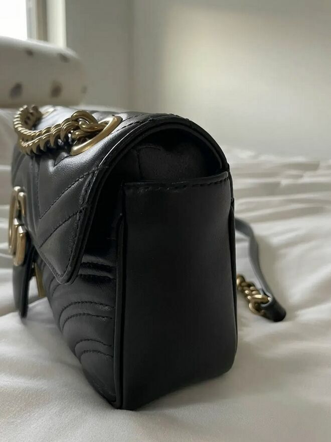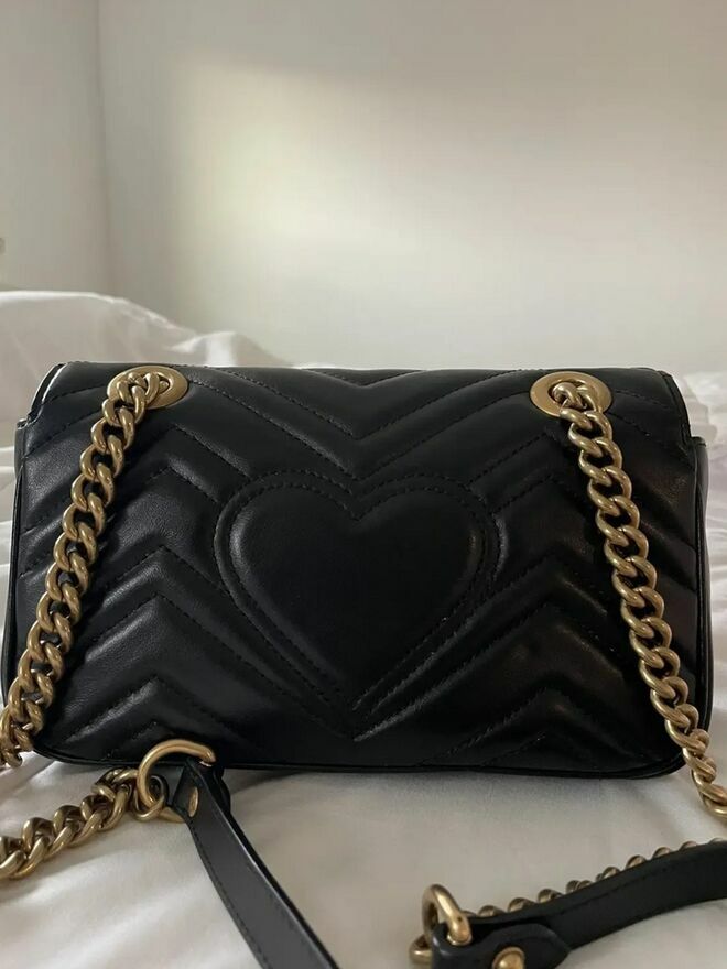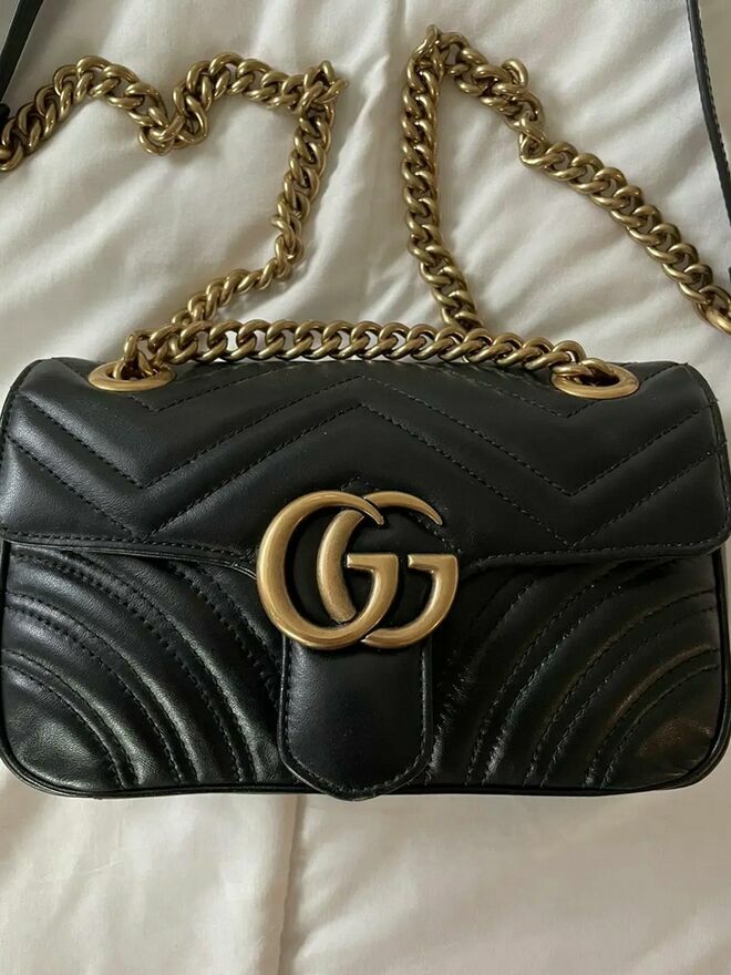 Oświadczam, że sprzedawany przedmiot jest w 100% oryginalny – to oryginalna torebka Gucci GG Marmont Small z czarnej skóry ze złotym łańcuchem.Torebka została zakupiona we wrześniu 2024 roku w oficjalnym butiku Gucci za 2300 €.